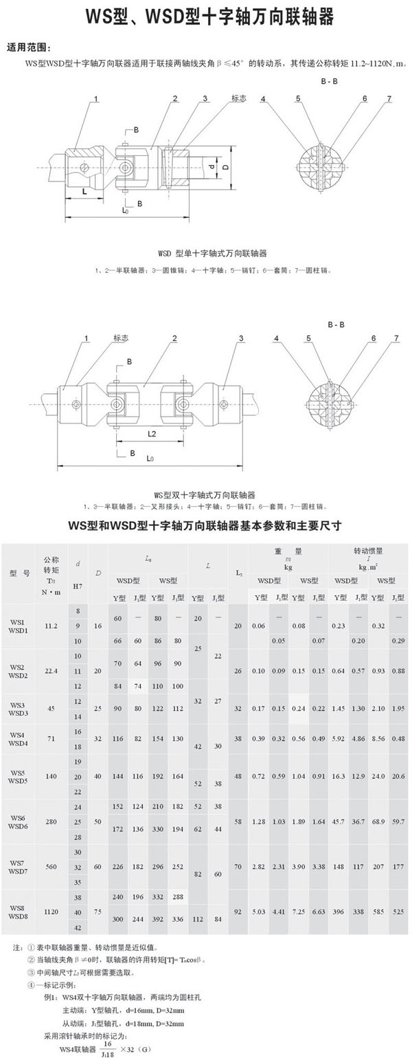 WS/WSD型十字軸式萬向聯(lián)軸器特點:使用于聯(lián)結(jié)空間同一平面上兩軸線夾角β≤45°的傳動場合?煞譃閱问中、雙十字型、可伸縮型和法蘭型。具有傳遞扭矩大,使用壽命長,應用范圍廣等特點。它的應用特別是對冶金行業(yè)的技術(shù)改造及機械產(chǎn)品更新?lián)Q代提供了在有利條件。中間采用方塊體加滑動軸承可傳遞大扭矩,采用滾針軸承可提高轉(zhuǎn)速,理論達到4000轉(zhuǎn)/分鐘。特殊設計更可達到10000轉(zhuǎn)/分鐘。